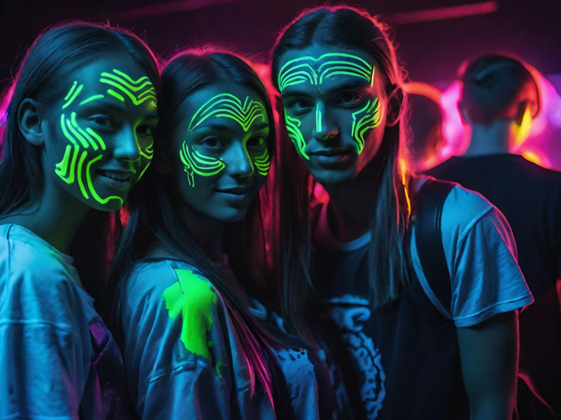 Extras: Fluorescent body or face painting for guests, and a collaborative glowing mural that comes to life under UV light.